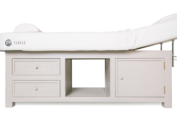 Patul profesional de wellness Fabulo Spa Harmony 304 are un cadru robust de culoare gri, fabricat din pin masiv , cu un design din rattan cu lăcuire multistrat pentru cea mai înaltă calitate. Datorită raftului inferior, a două sertare si a unui dulap cu usi, uneltele dvs. vor fi întotdeauna la îndemână si în locul potrivit.