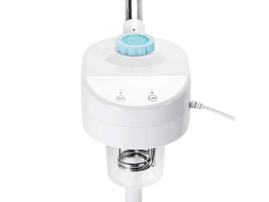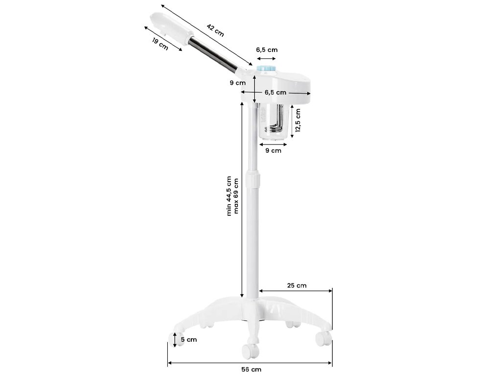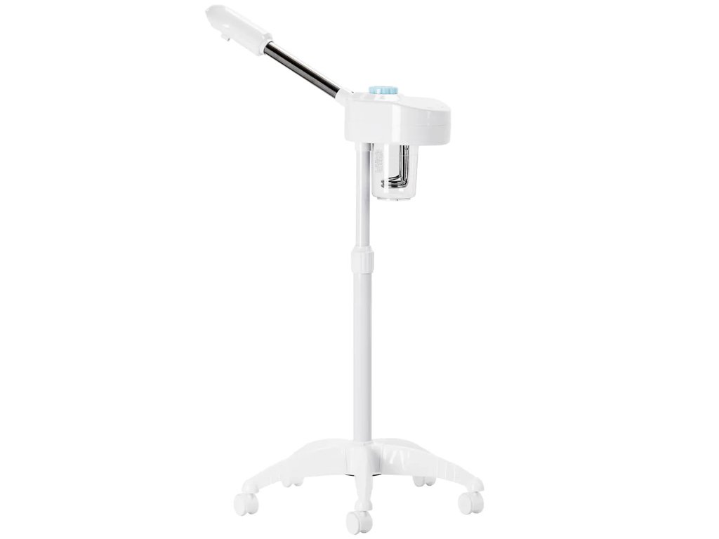 Vaporizarea cu vaporizatorul cosmetic D-09 pregăteste perfect pielea pentru curătare sau masaj facial si nu ar trebui să lipsească din niciun salon de înfrumusetare. Aparatul de aburi facial multifunctional are un trepied, ceea ce facilitează ajustarea înăltimii sale. O bază cu patru brate pe roti asigură stabilitatea sa. În pachet este inclus dispozitivul cu duză, trepied, suport cu roti si instructiuni de utilizare.