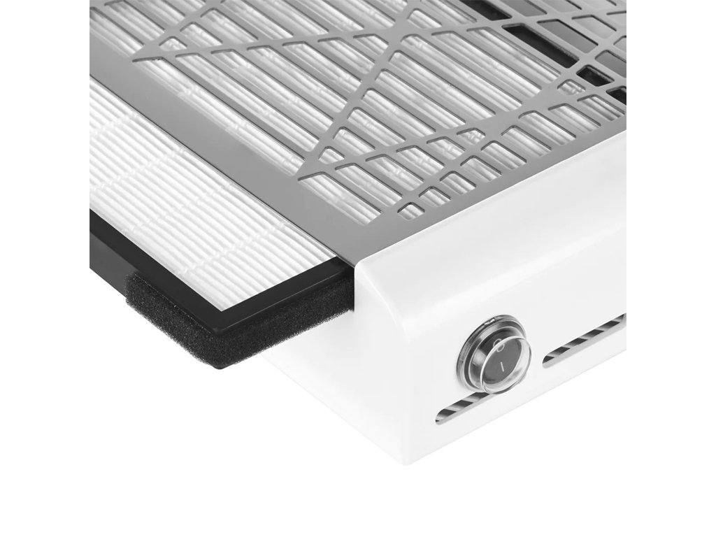 Dispozitivul este conceput pentru a proteja eficient sănătatea atât a stilistei, cât și a clientei. Puterea de 40 W, combinată cu filtrul tip casetă de înaltă calitate, capturează cu succes praful fin, menținând astfel mediul de lucru curat și sigur. Suprafața mare de aspirare permite lucrul cu ambele mâini deasupra aspiratorului.