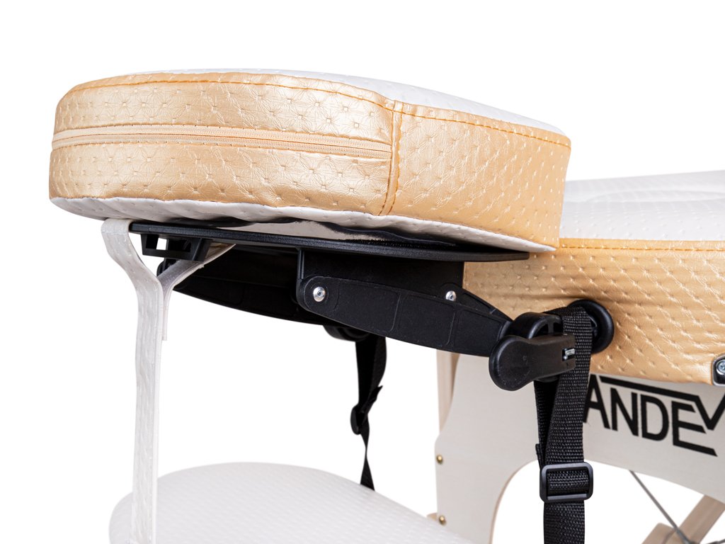Confortul pe tot parcursul terapiei este asigurat de o căptușeală groasă de 5 cm, acoperită cu tapițerie PU de înaltă calitate, cu o suprafață structurată, plăcută la atingere, rezistentă la uleiurile de masaj și ușor de întreținut. O deschidere practică pentru față, cu opritor, crește confortul clientului când stă întins pe burtă. Tetiera ergonomică reglabilă, cu pernă în formă de „U”, susține confortabil capul clientului, permite un masaj complet al gâtului și extinde suprafața utilizabilă a mesei până la 222 cm, ideală chiar și pentru clienții mai înalți.