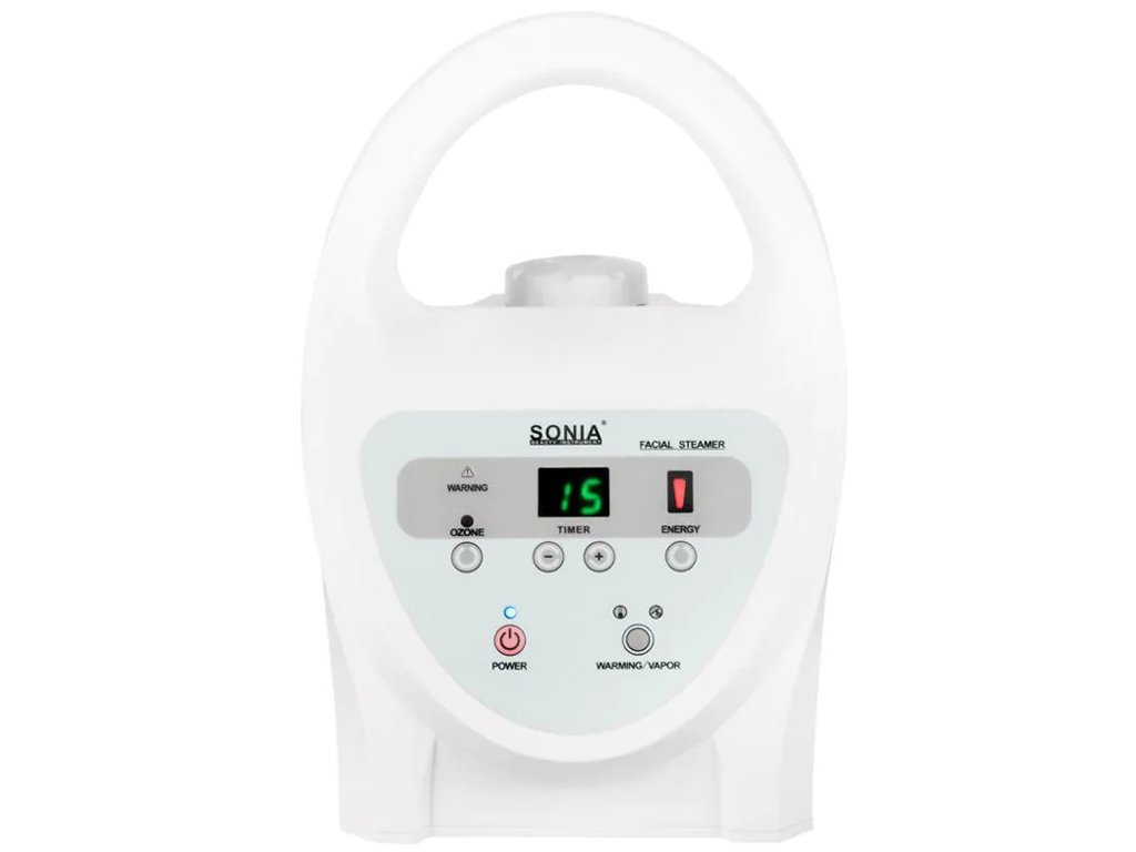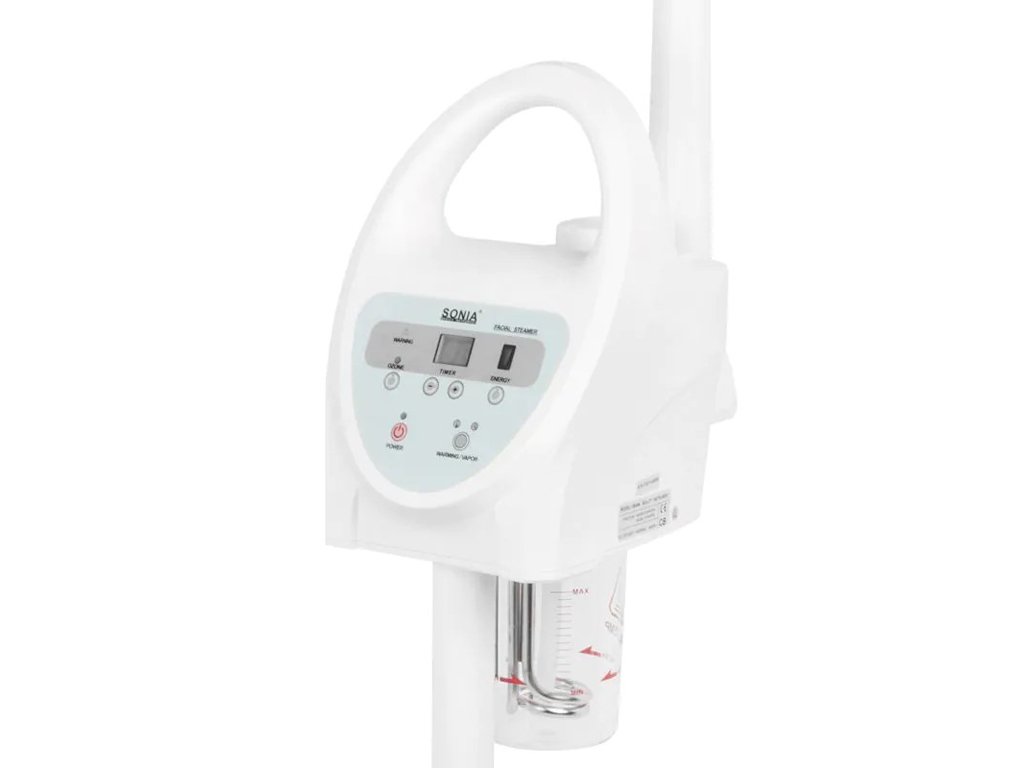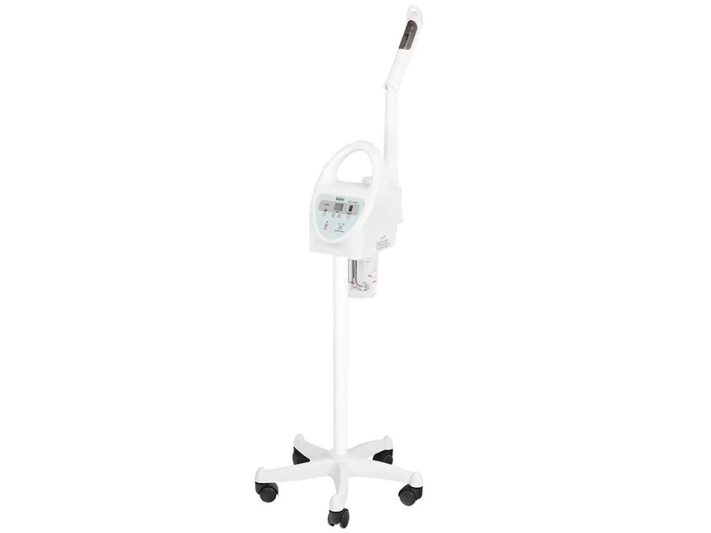 Vaporizator multifuncțional cu abur fierbinte și ozon, cu durată și intensitate a aburului reglabile. Dispozitivul este echipat cu un cap special pentru aburi, prevăzut cu o articulație mobilă, care permite direcționarea precisă a aburului direct către fața clientului. Aparatul este așezat pe un suport stabil și are un design modern, cu bază din oțel inoxidabil, ceea ce îi conferă durabilitate și un aspect profesional.